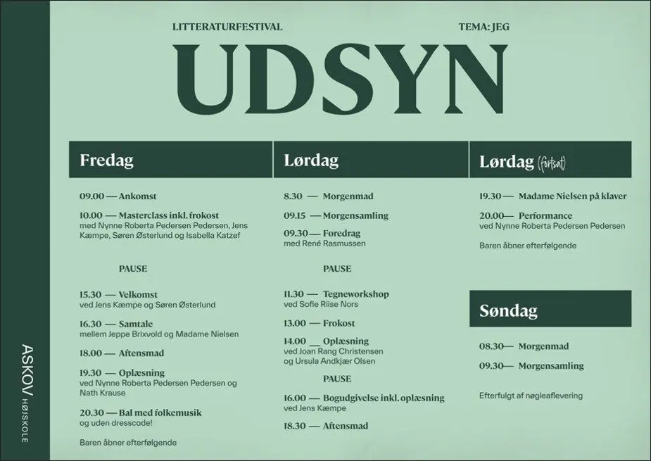 UDSYN er festivalen, hvor litteratur er udgangspunktet og en af Danmarks ældste højskoler danner ramme for både fordybelse, opdagelse, nysgerrighed og som altid fællesskab. Festivalen udspringer af Askov Højskoles 160-årige tradition for oplysning, perspektiv og åbne samtaler — en tradition, der i årtier fandt form i tidsskriftet Dansk Udsyn, og som nu lever videre i festivalen UDSYN.